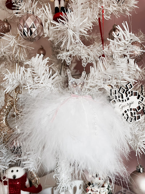 The swan is one I've had since 2017 and it's quite heavy for my tree so I prop it on a branch to keep it up. I love it. It was from The Range and was really cheap. The reindeer was again, from The Range I think the same year. I'm getting quite bored of it and feel like I need to put it away for another year but I needed to fill a gap. Again, with the shoe, I'm getting quite bored of that. It was from The Range and I think it's beautiful but I have to put it at the bottom of the tree because it's a bit too big for my tree. My Cath Kidston guinea pig decoration is my favourite and the one I look forward to getting out for the past few years I've had it. It's glass so It's very delicate and I keep it in it's original box until christmas time. Having owned guinea pigs for 21 years I absolutely love them and when I saw this decoration I had to get it. A newer decoration I got was this beautiful dress. It's from The Range and I thought it was so pretty.